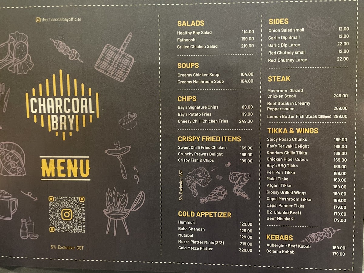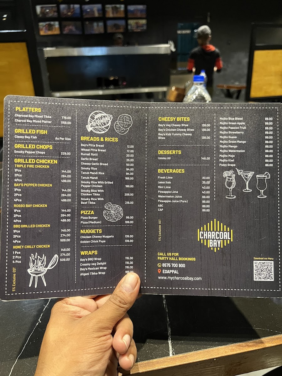 Introducing the menu of The Charcoal Bay, a culinary gem nestled in Edappal, Kerala, where flavor takes center stage. The menu features an extensive array of tikka and wings, each priced attractively at ₹169. Indulge in the Spicy Rosso Chunks, Bay's Teriyaki Delight, or the tantalizing Chicken Lava Tikka at ₹179. For those craving something cheesy, their Veg and Chicken Cheesy Bites at ₹139 are particularly delightful.
